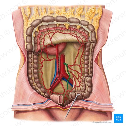 Die Arteria mesenterica inferior (untere Eingeweidearterie) ist eine kräftige, unpaare Arterie im Abdomen.