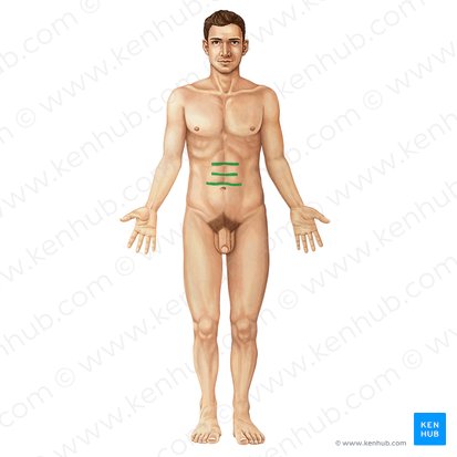 - Neun abdominopelvine Regionen: Die neun Regionen liegen zwischen einer gedachten oberen horizontalen Linie, die direkt unter dem Rippenbogen der 10. Rippen verläuft und einer unteren horizontalen Linie, die zwischen den Tubercula iliaca verläuft. Vertikal werden sie von zwei Linien, die jeweils von der Mitte der Clavicula nach unten zwischen die Symphysis pubis und Spina iliaca anterior superior verlaufen, in drei vertikale Reihen geteilt. Durch diese vier Linien wird die Bauchwand in neun abdominelle Regionen gegliedert: eine obere Regio epigastrica, die mittlere Regio umbilicalis, die untere Regio pubica und jeweils eine linke und eine rechte Regio hypochondrica, Regio lumbalis und Regio inguinalis.