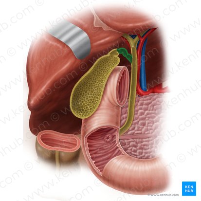 Der Ductus hepaticus communis liegt an der Leberpforte und verbindet sich mit dem Ductus cysticus (Gallenblasengang) zum Ductus choledochus.
