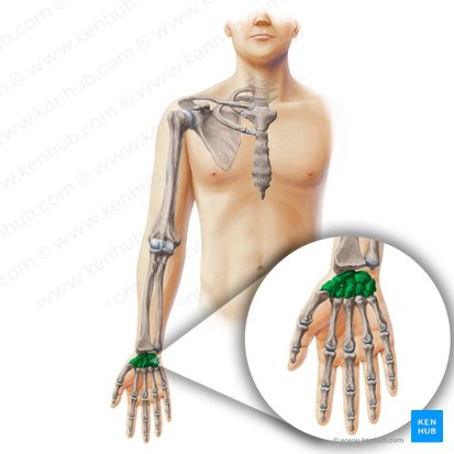 Proximale Reihe: Os scaphoideum, Os lunatum, Os triquetrum, Os pisiforme Distale Reihe: Os trapezium, Os trapezoideum, Os capitatum Os hamatum |
