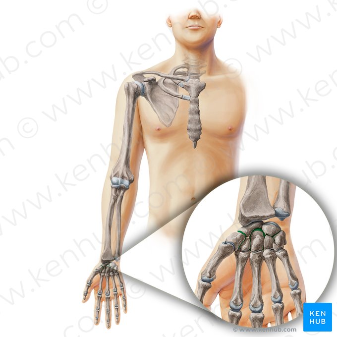 | Gelenke | Articulationes intercarpales, Articulationes carpometacarpales, Articulatio mediocarpea (distal), Articulatio radiocarpea (proximal) |