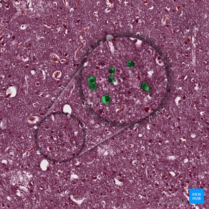 Das Nervensystem lässt sich in das zentrale Nervensystem (ZNS) und das periphere Nervensystem (PNS) unterteilen. Zum ZNS gehört das Gehirn und das Rückenmark, die beide aus weißer und grauer Substanz bestehen. In der grauen Substanz befinden sich vor allem die Perikaryen der Neuronen, ihre Dendriten und die Gliazellen, wohingegen die weiße Substanz vor allem aus den myelinisierten Axonen der Neurone besteht.