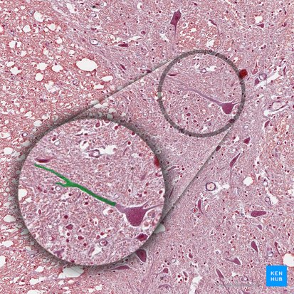 Die EZM des Nervengewebes ist reich an Grundsubstanz mit einem nur geringen Anteil an Proteinfasern wie dem Kollagen. Neurone sind spezialisierte Zellen des zentralen und peripheren Nervensystems. Sie bestehen aus einem Zellkörper (Soma bzw. Perikaryon) und Zellfortsätzen (Dendriten und Axone). Je nach Anzahl ihrer Fortsätze kann man sie in unipolar, bipolar und multipolar einteilen. Diese Fortsätze kommunizieren über chemische Synapsen miteinander und mit anderen Zelltypen, um elektrische Signale weiterzuleiten.