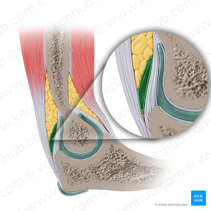 Unter der Trizepssehne befindet sich ein wichtiger Schleimbeutel, der sie vor übermäßiger Reibung mit dem Olecranon schützt (Bursa subtendinea musculi tricipitis brachii).