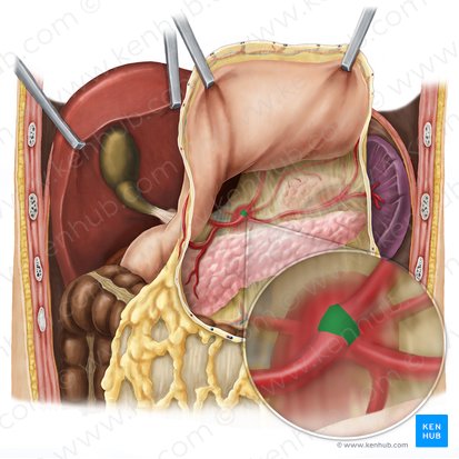 Die A. gastroduodenalis hingegen steigt hinter dem Pylorus ab und teilt sich an dessen Unterrand in die A. gastroepiploica dextra und A. pancreaticoduodenalis superior.