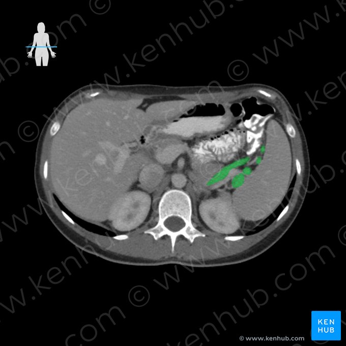 Sie entsteht am Milzhilus und verläuft nahezu horizontal durch den Oberbauch.