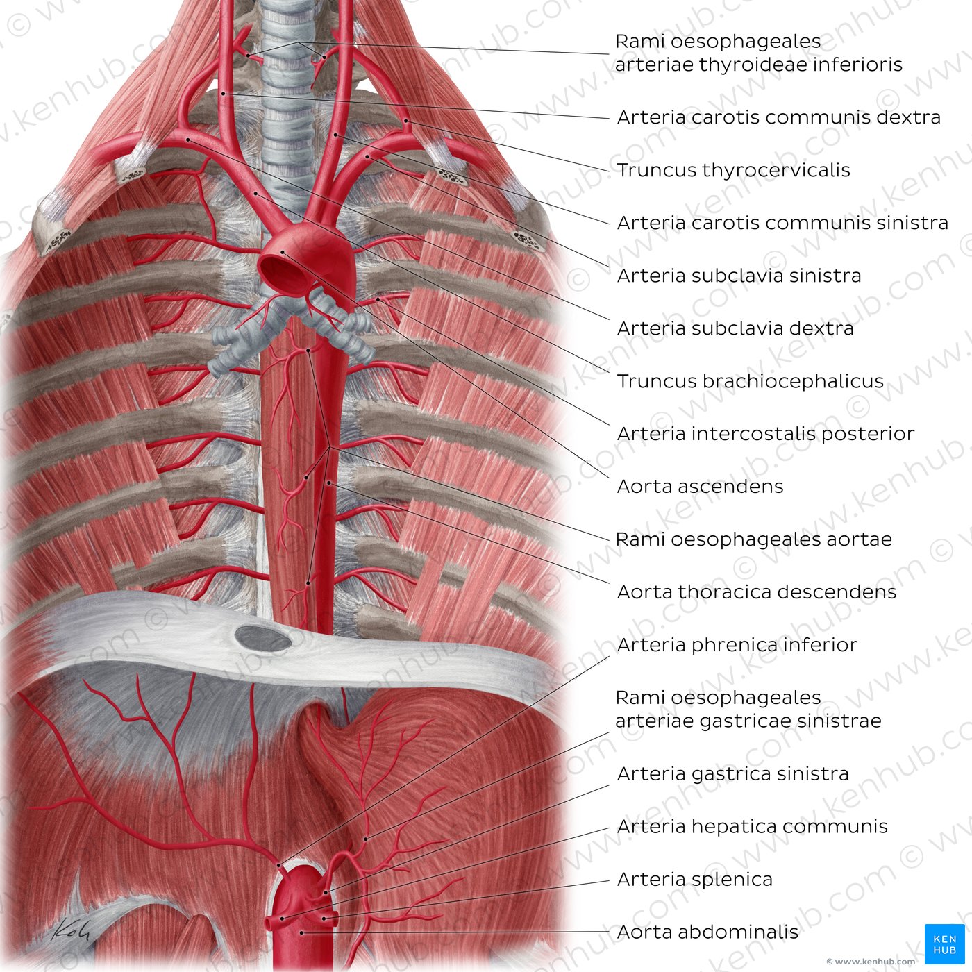 | Arterien | Aorta thoracica descendens und ihre Äste: Rr. pericardiaci aortae, Rr. bronchiales aortae, Rr. oesophagei aortae, Rr. mediastinales aortae, Aa. intercostales posteriores, A. phrenica superior, A. subcostalis |