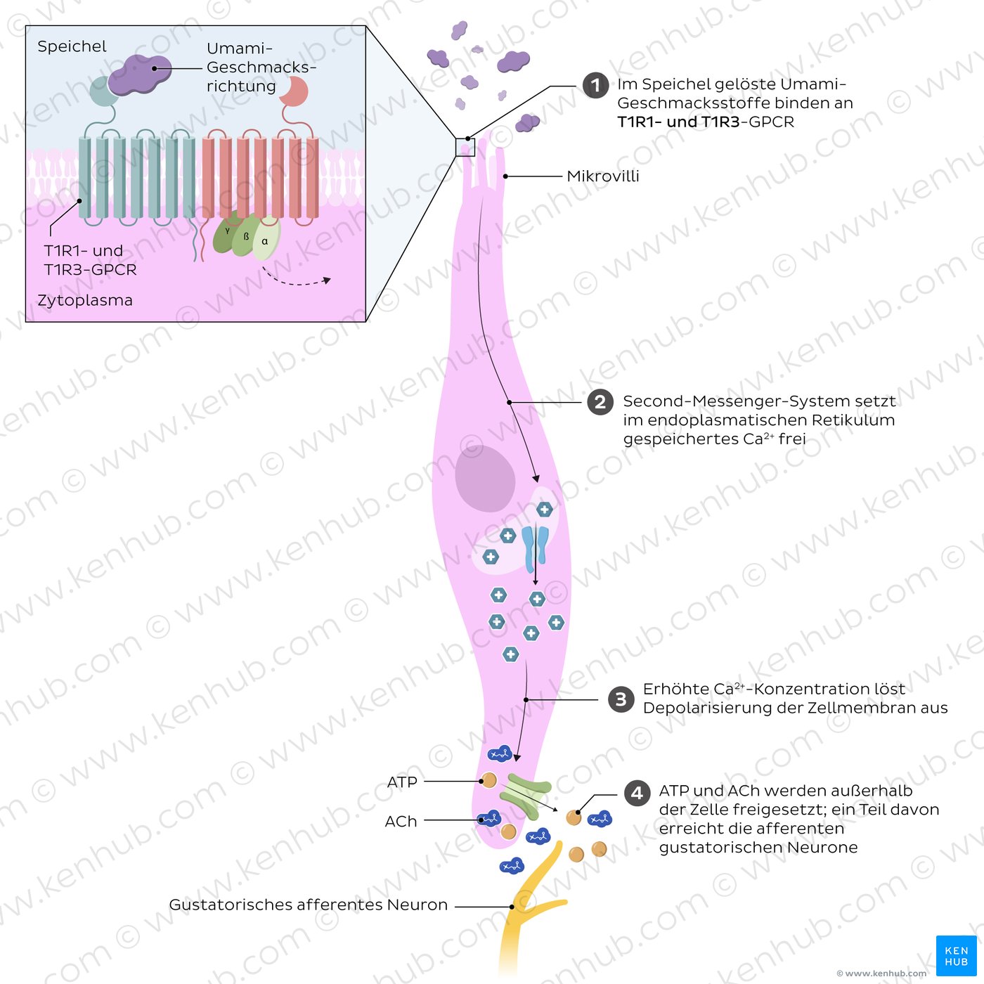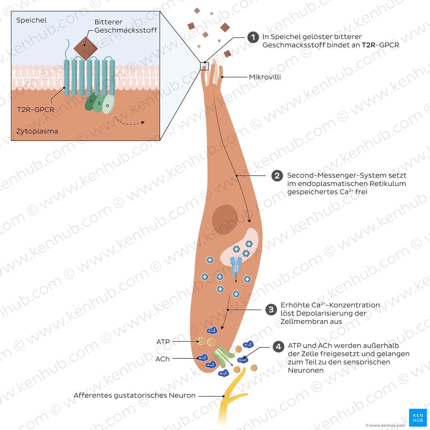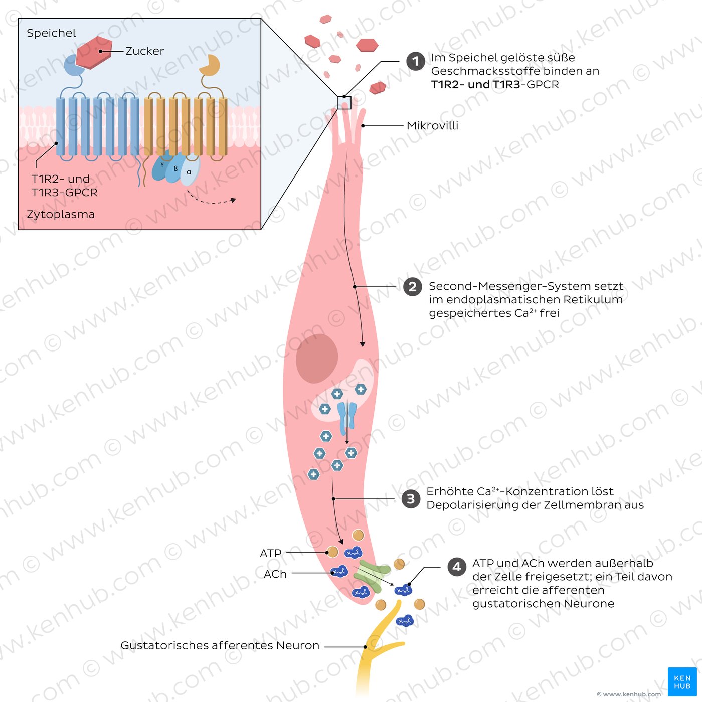 Wenn sich Speichel an der Spitze der Geschmacksknospe in der Geschmackspore sammelt, interagieren die Mikrovilli der Geschmackszellen mit den im Speichel gelösten Geschmacksstoffen, wodurch die gustatorische Transduktion ausgelöst wird. Die Signaltransduktion für salzig und sauer ist ionotrop, d.h. es kommt zur Aktivierung von Ionenkanälen und Veränderungen der Konzentration von Na+-Ionen (salzig) und H+-Ionen (sauer). Im Gegensatz dazu ist die Transduktion für süß, bitter und umami metabotrop, d.h. G-Protein-gekoppelte Rezeptoren aktivieren intrazelluläre Signalwege.