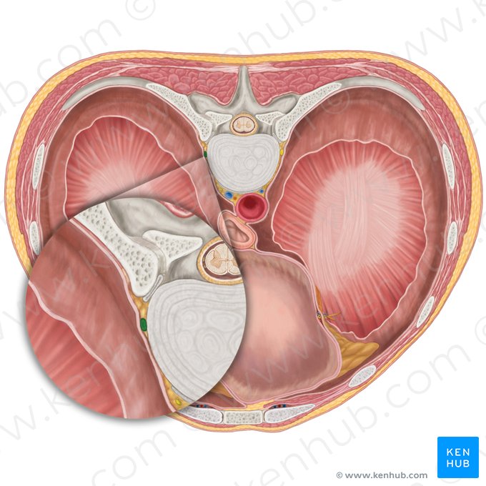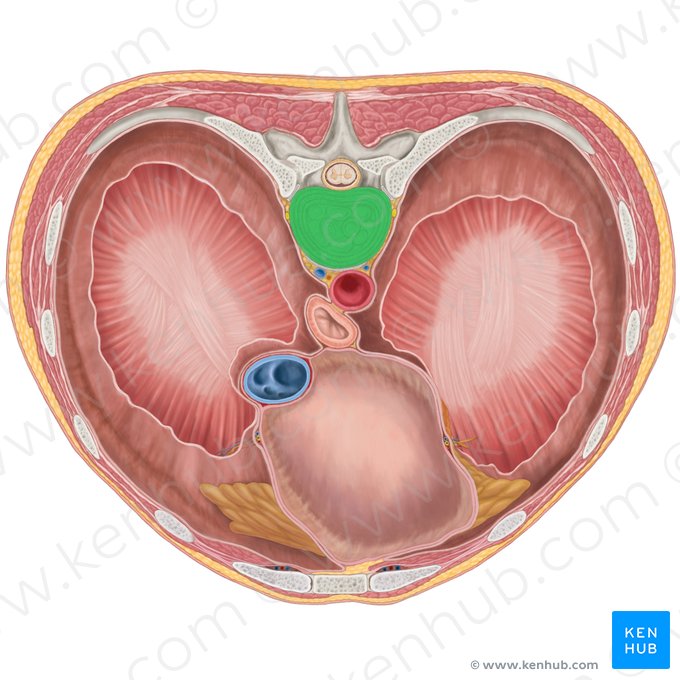 Das Zwerchfell (Diaphragma) ist eine große, kuppelförmige, muskulotendinöse Struktur, welches die Brusthöhle von der Bauchhöhle trennt. Seine Muskelfasern entspringen peripher und verlaufen nach medial, wo sie in die rechte und linke Sehnenplatte des Zwerchfells (Centrum tendineum diaphragmatis) inserieren. Die Kontraktion dieses großen Muskels ist entscheidend für die Atmung. Bei der Kontraktion flacht die kuppelförmige Struktur des Zwerchfells ab und vergrößert somit die Brusthöhle, damit Luft in die Lungen strömen kann. Das Zwerchfell wird durch den linken und rechten N. phrenicus innerviert, welcher jeweils aus den Spinalnervensegmenten C3 bis C5 entsteht. Es gibt einige Öffnungen, die den Durchtritt verschiedener Strukturen durch das Zwerchfell ermöglichen. Die drei größten Öffnungen sind nach den darin verlaufenden Strukturen benannt: der Hiatus aorticus, Hiatus oesophageus und das Foramen venae cavae.
