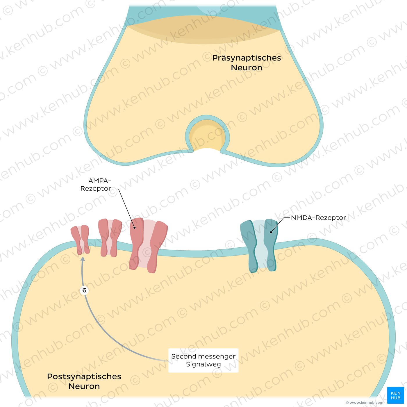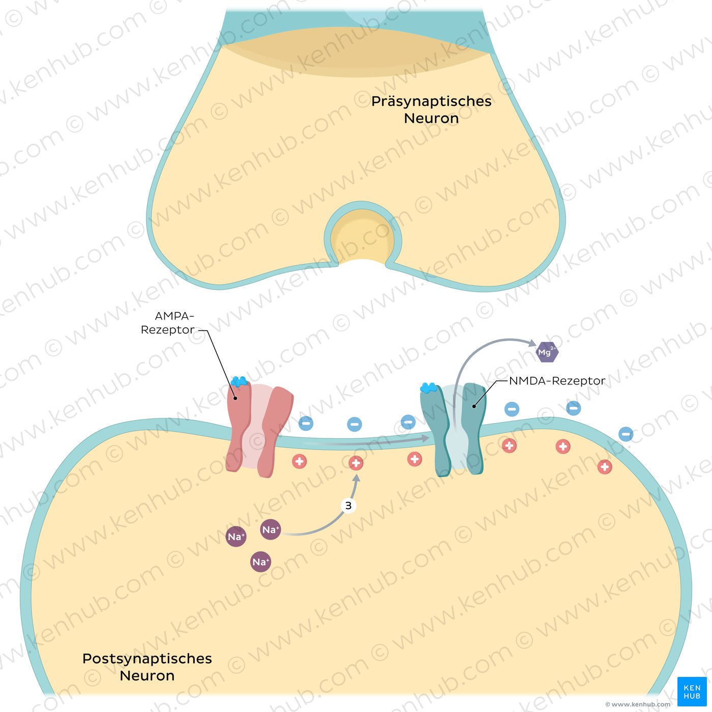 Langzeitpotenzierung (LTP) | Das präsynaptische Neuron setzt Glutamat frei > Na⁺-Ionen gelangen über AMPA-Rezeptorkanäle in das postsynaptische Neuron > Depolarisation der Membran > Entfernung des blockierenden Mg²⁺-Ions aus den NMDA-Rezeptorkanälen > Ca²⁺-Ionen strömen ein und aktivieren sekundäre Botenstoffe > die synaptische Verbindung wird dauerhaft verstärkt (vermehrten Einbau und gesteigerte Leitfähigkeit von AMPA-Rezeptoren, erhöhte Glutamatfreisetzung im präsynaptischen Neuron) |