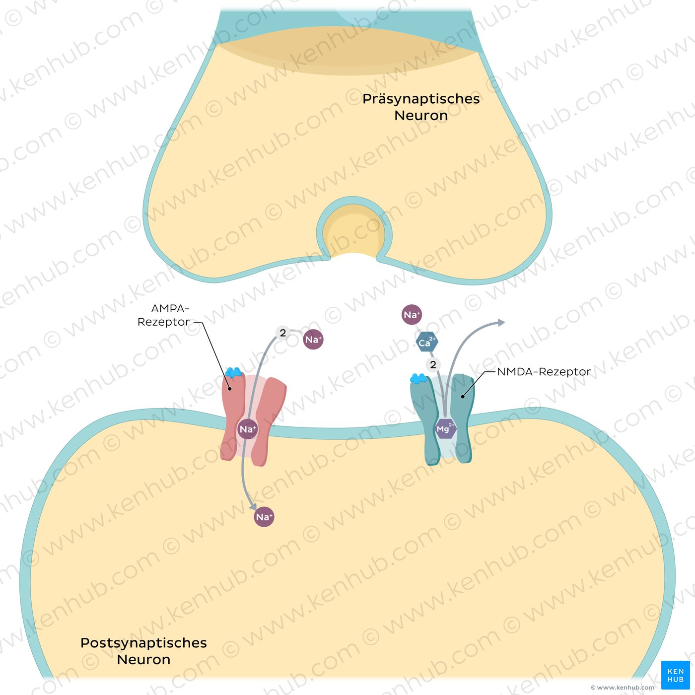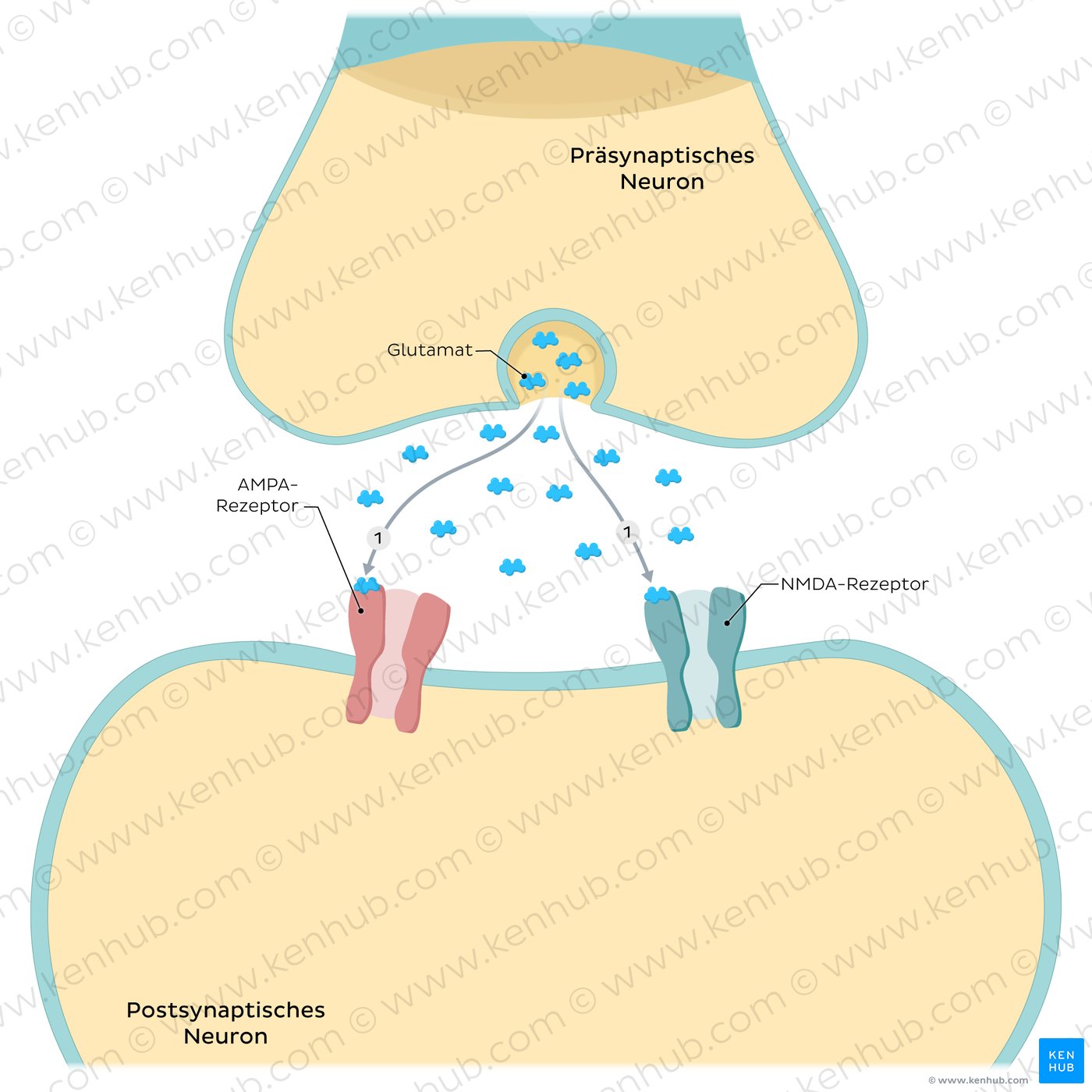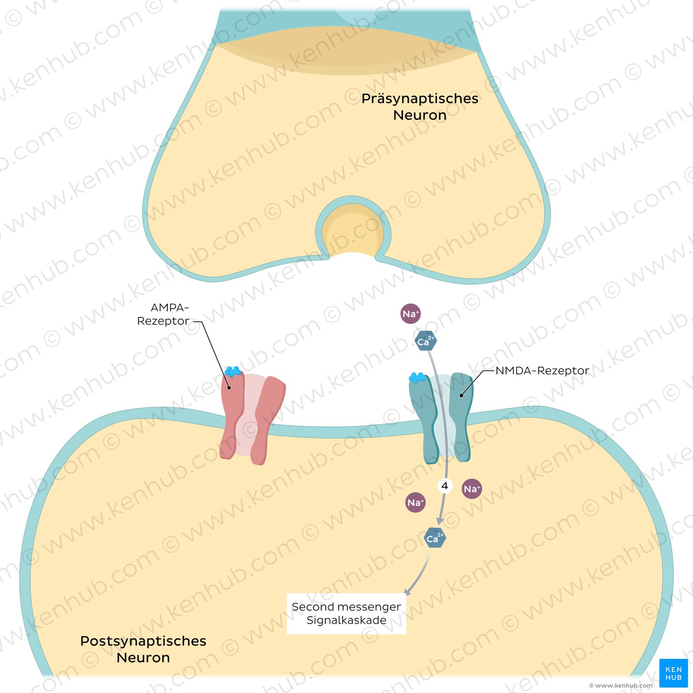 Die Konsolidierung von Erinnerungen erfolgt durch die Stärkung der Verbindungen zwischen den Neuronen, ein Prozess, der als Langzeitpotenzierung („long-term potentiation”, LTP) bezeichnet wird. Dabei setzt das präsynaptische Neuron Glutamat frei, das an AMPA-Rezeptoren des postsynaptischen Neurons bindet. Der dadurch ausgelöste Einstrom von Natriumionen (Na+) depolarisiert die Zelle und erleichtert den Einstrom von Calciumionen (Ca2+) durch NMDA-Rezeptorkanäle. Die erhöhte intrazelluläre Calciumkonzentration steigert die Menge an freigesetztem Glutamat im präsynaptischen Neuron und verstärkt den Ionenfluss im postsynaptischen Neuron. Auf diese Weise entsteht eine dauerhafte Verstärkung der synaptischen Verbindung, sodass neuronale Bahnen im Gehirn gebildet werden, die das Speichern und Abrufen von Erinnerungen ermöglichen.