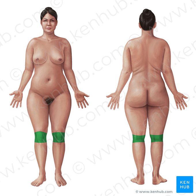 Vordere Kniegegend (Regio genus anterior) Kniescheibenregion (Regio patellaris) Hintere Kniegegend (Regio genus posterior) Kniekehle (Fossa poplitea) |