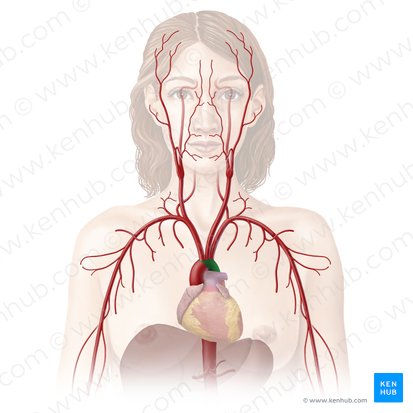 The aorta is the first segment of the systemic arterial circulation, originating directly from the left ventricle of the heart. It is the largest artery in the body consisting of three parts that each has its special characteristics, most notably in their direction and orientation. At the beginning of its course, the aorta runs upwards as the ascending aorta then shortly after arches laterally to the left, forming the arch of aorta. After that, the aorta continues downwards as the descending aorta until it divides into its terminal branches.