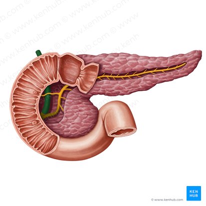 The bile duct joins the pancreatic duct at the hepatopancreatic ampulla, these two ducts then empty their products (bile and pancreatic juice, respectively) together into the duodenum via the major duodenal papilla. Both the bile duct and the pancreatic duct have sphincters which control the emptying of these liquids into the dilated hepatopancreatic ampulla. These sphincters are named the sphincter of bile duct and sphincter of pancreatic duct. As it descends, the bile duct passes posterior to the duodenum then posterior to the head of the pancreas, lying in a fissure (groove) in the pancreatic head.