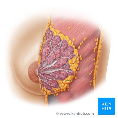 The mammary glands are modified apocrine sweat glands. They are structurally dynamic, meaning that the anatomy changes depending on a woman’s age, menstrual cycle phase and reproductive status. The glands are active in adult women after childbirth (postpartum period). In this period, the pituitary hormone prolactin stimulates the glands to produce milk, while the hypothalamic hormone oxytocin stimulates the ejection of milk through the nipple. Outside of the postpartum period, the glands are less abundant with most of the breast tissue being filled with adipose.