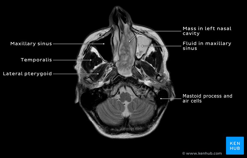 In the MRI images the maxillary sinus mass has a higher intensity than that of the tumor and therefore, as noted in the text, is not part of the tumor mass but rather is mucous that has been secreted in response to the tumor. This difference was not discernible in the CT images and this information informed the surgeons that they did not need to involve the maxillary sinus in their surgical extirpation but rather they just needed to drain the sinus.