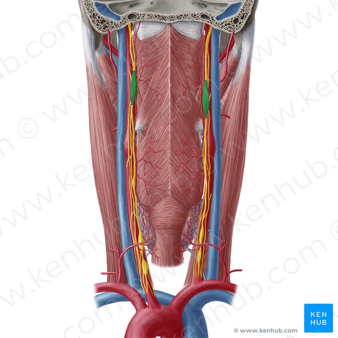 - The superior cervical ganglion lies below the base of the skull. It receives fibers from the upper thoracic segment via the interganglionic branches, whereas its postganglionic fibers form plexuses around the internal carotid artery and external carotid artery. Branches from the internal carotid plexus extend to: