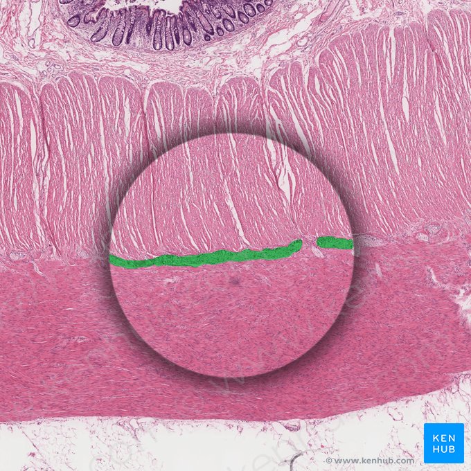 - Auerbach's plexus: also referred to as the myenteric plexus, lies in the connective tissue between the circular muscle layer and the muscularis mucosae.