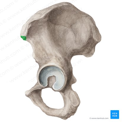 The anterior border of the ilium extends from the anterior superior iliac spine to the acetabulum. It features the anterior inferior iliac spine just superior to the acetabulum. This spine provides a point of attachment for the straight head of the rectus femoris muscle and proximal part of the iliofemoral ligament.