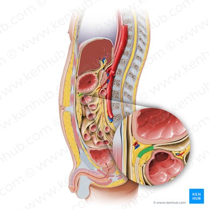 The celiacoduodenal part of the suspensory ligament of the duodenum is a thin muscular band originating from the celiac trunk as a connective tissue band. It passes between the splenic vein, left renal vein and the pancreas to insert at the duodenojejunal flexure (DJ flexure) and part of the inferior aspect of the transverse duodenum. This segment is sometimes referred to as the suspensory muscle of the duodenum proper. It is a very thin muscle and is roughly triangular at its origin but tapers and becomes narrower toward its fibrous insertion. Histologically, the suspensory muscle of the duodenum is comprised of smooth muscle fibers arising from the enteric end of the muscle.