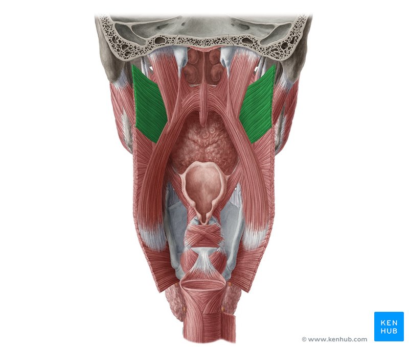 The superior constrictor muscle of the pharynx originates from the pterygoid hamulus, the pterygomandibular raphe, as well as the posterior end of mylohyoid line of mandible. The superior fibers attach to the pharyngeal tubercle of the basilar part of the occiput of the skull, by way of the pharyngeal raphe. The inferior fibers blend with the middle constrictors to the level of the vocal folds.