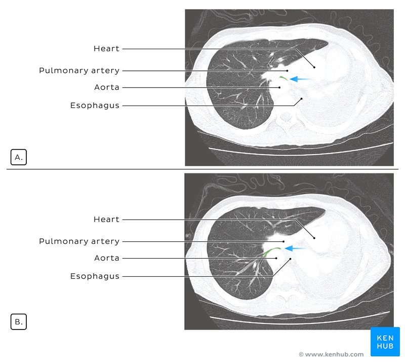| Bronchial arteries | Bronchial arteries provide nourishment to the supporting lung tissues but do not participate in gas exchange. The left bronchial artery arises from the aorta, while the right bronchial artery arises from a posterior intercostal artery or sometimes from the left bronchial artery. |