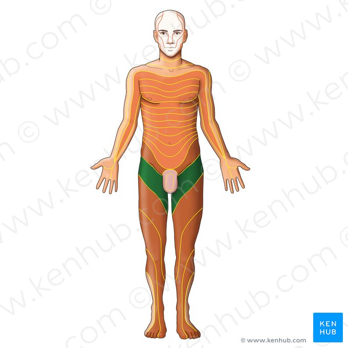 Dermatomes are a defined area of skin to which the sensory component of a spinal nerve is distributed to a specific spinal cord segment. All dermatomes from the shoulders down relay their sensory information back to the CNS through spinal nerves.