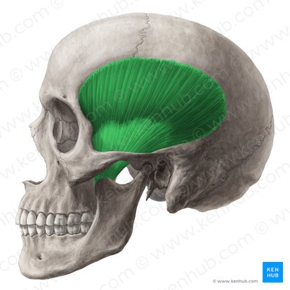The temporalis muscle is a large, flat muscle that lies within the temporal fossa of the skull. This fan-shaped muscle arises from the entirety of the temporal fossa below the temporal line, as well as the deep surface of the temporal fascia. Its muscle fibers converge anteriorly to form a tendon which runs deep to the zygomatic arch. The tendon then inserts on the apex and medial surface of the coronoid process, and the anterior border of the ramus of mandible.