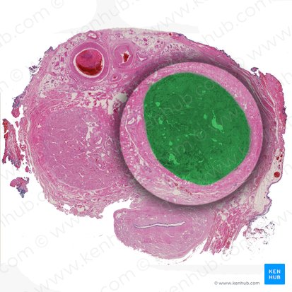 The corpus spongiosum is a spongy mass of the erectile tissue found within the ventral compartment of the penis. It has a proximal dilation that projects into the root of penis, i.e. the bulb of penis. The corpus spongiosum features a distal bulbous expansion at the end of the penile shaft as well, which forms the glans penis. The glans shows a rounded base called the corona which demarcates it from the penile shaft. The glans is covered by the foreskin (prepuce), which is a double layer of loose retractable skin that attaches to the ventral surface of glans. The attaching site of the deep layer of the foreskin to the urethral surface lies under the corona and is called the frenulum.