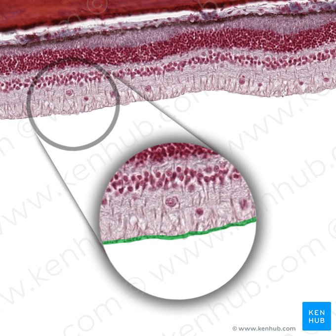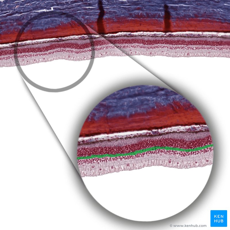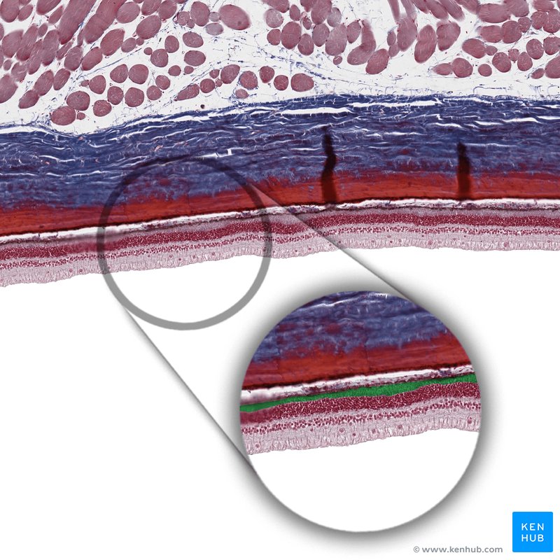 | Retina | Retinal pigmented epithelium, photoreceptor layer, outer (external) limiting membrane, outer nuclear layer, outer plexiform layer, inner nuclear layer, inner plexiform layer, ganglion cell layer, nerve fiber layer, inner limiting membrane |