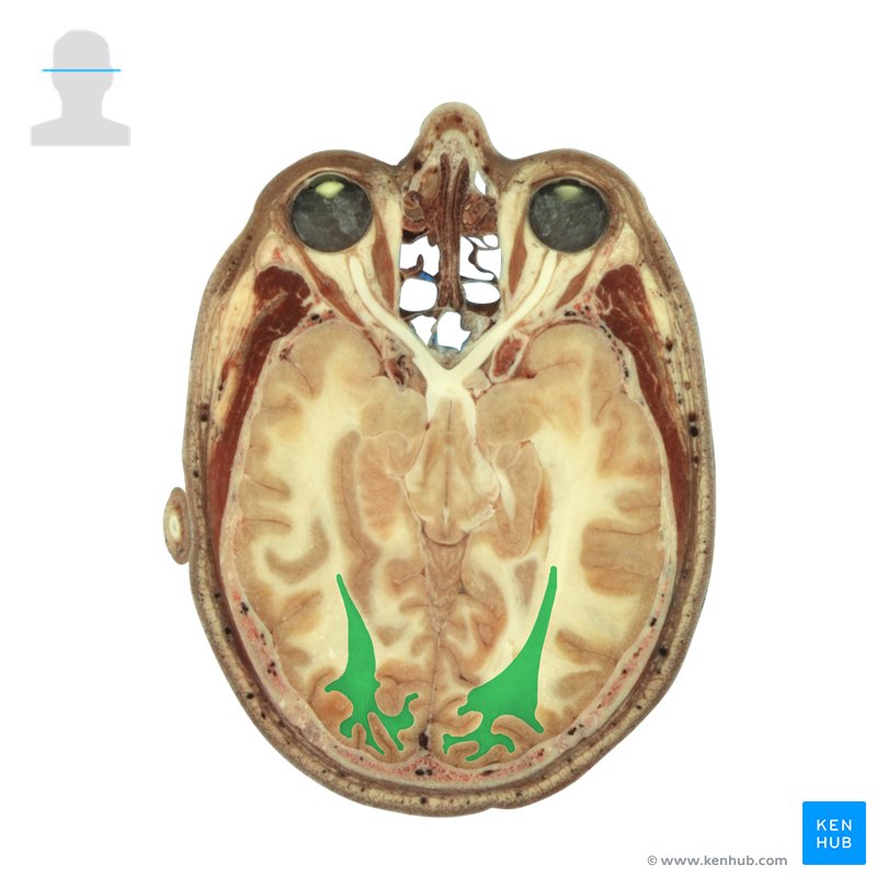 The fibers emerging from the lateral geniculate body form the optic radiation (geniculocalcarine tract). There are six layers within this tract that receive retinotopic input from the corresponding visual field. They are then separated into two loops; one takes a direct course to the visual cortex, while the other takes an indirect route.