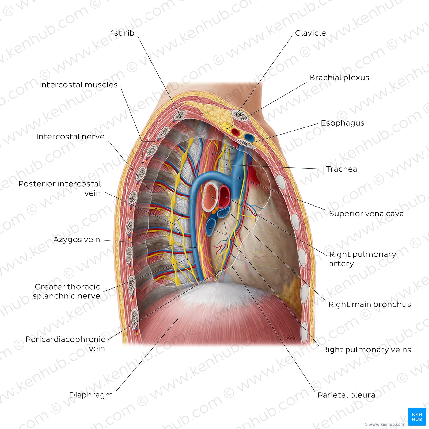 As you’ve seen above, the thorax contains more than thoracic arteries, nerves, and lymphatics. It also contains vital organs and structures, such as the heart, lungs, thymus, trachea, and esophagus.