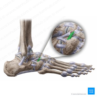 The thin and broad dorsal calcaneocuboid ligament reinforces the calcaneocuboid joint dorsally. The calcaneocuboid ligament strengthens the dorsomedial aspect of the calcaneocuboid joint. Its details have been discussed previously.