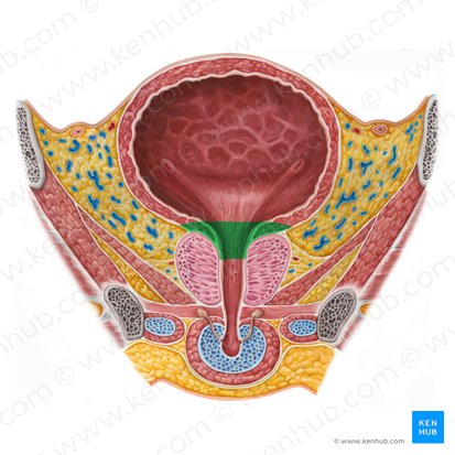 In males, the neck of the bladder is surrounded by the prostate gland.