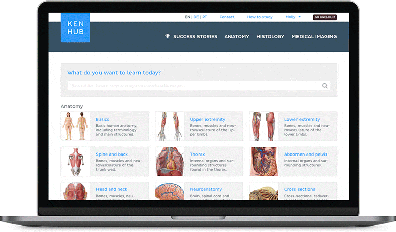 Simply put, Kenhub is an all-in-one online anatomy, histology and medical imaging learning tool. With a huge color atlas, an extensive library of articles and hundreds of interactive quizzes and videos on every topic, our goal is to help you learn anatomy as quickly, efficiently, and enjoyably as possible.