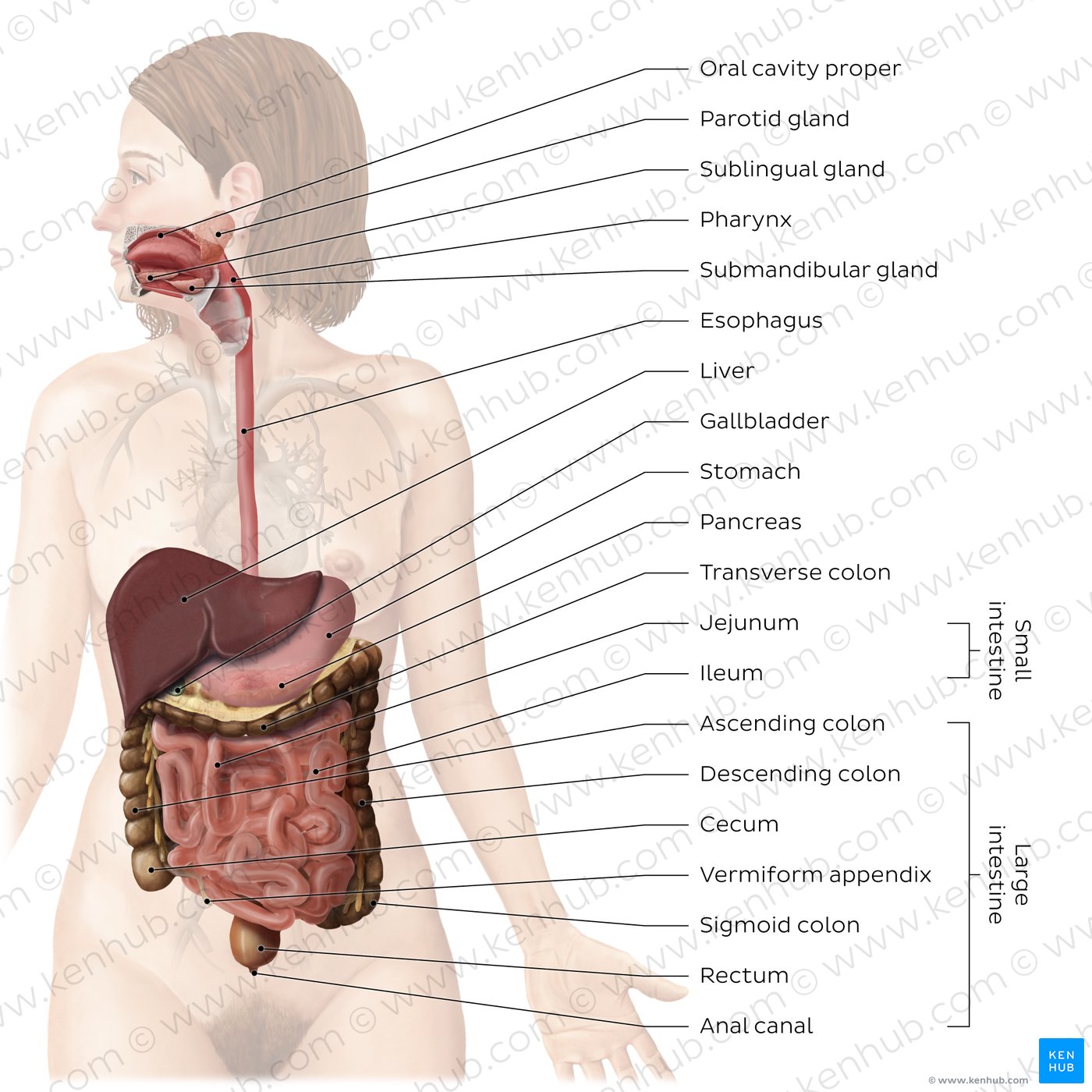 Alimentary canal: Oral cavity proper, pharynx, esophagus, stomach, small intestine (duodenum, jejunum, ileum), large intestine (cecum, vermiform appendix, ascending colon, transverse colon, descending colon, sigmoid colon), rectum and anal canal Accessory digestive organs: Salivary glands (sublingual, submandibular, parotid), liver, gallbladder and pancreas |