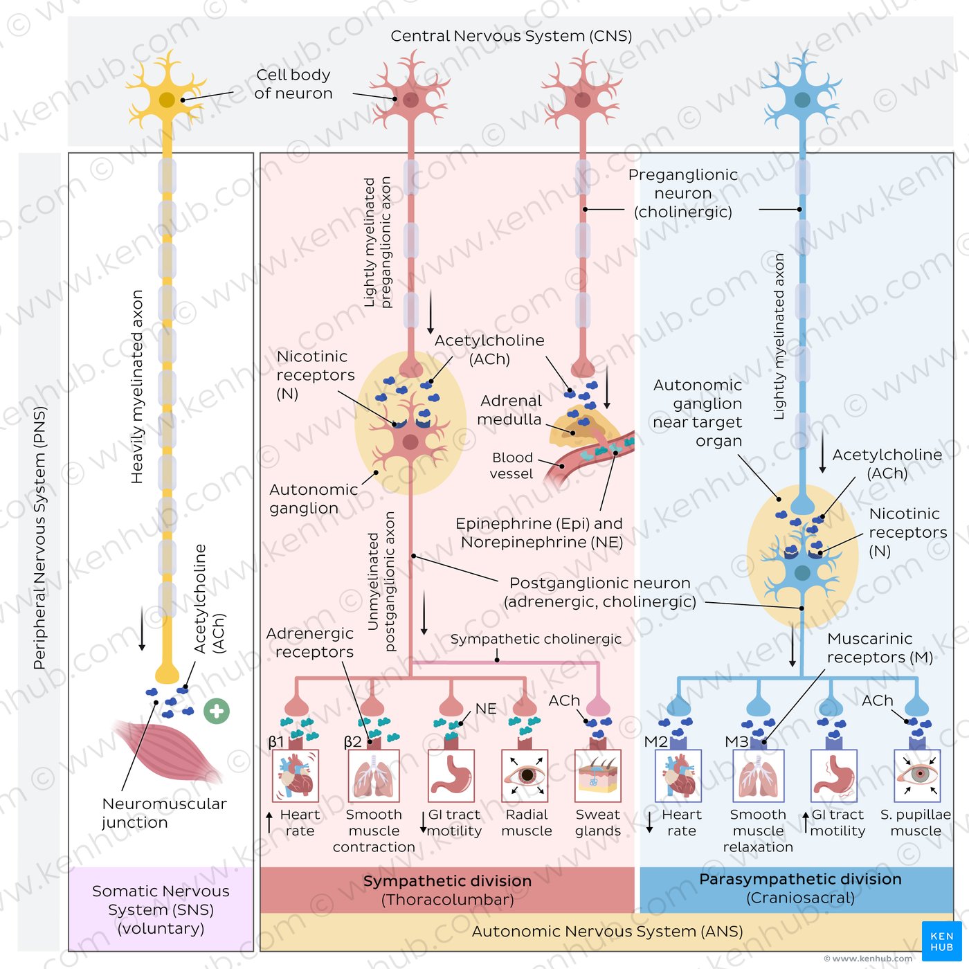 Neurotransmitters such as acetylcholine (ACh) and norepinephrine (NE) transmit signals between neurons and target organs. The type of receptor they bind to determines the physiological response. Nicotinic and muscarinic receptors mediate cholinergic transmission, while adrenergic receptors regulate responses to norepinephrine. Understanding how these systems interact provides insight into their role in health and disease, such as autonomic dysfunctions in conditions like hypertension or heart failure.