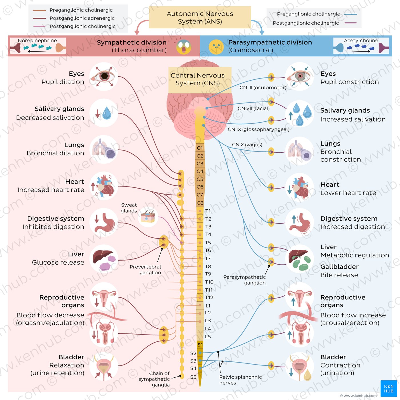 The ANS exerts its effects through a network of neurons that originate in the central nervous system (CNS) and communicate with peripheral organs via autonomic ganglia. The sympathetic division generally stimulates physiological processes that enable the body to respond to stress, while the parasympathetic division conserves energy and restores normal function after stressors have subsided.