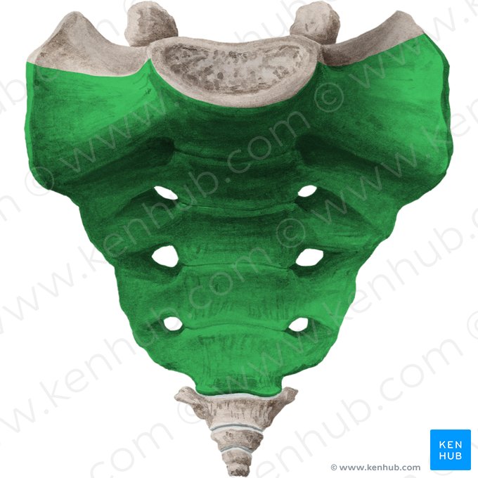 The sacrum is a triangular bone comprising five fused sacral vertebrae, S1-S5. It articulates with the iliac components of the hip bones via the sacroiliac joint, therefore contributing to the pelvic girdle and playing an important role in stabilization of the pelvis. Superiorly, it articulates with the inferiormost lumbar vertebra (L5) to form the lumbosacral joint. Inferiorly, it articulates with the coccyx to form the sacrococcygeal joint.