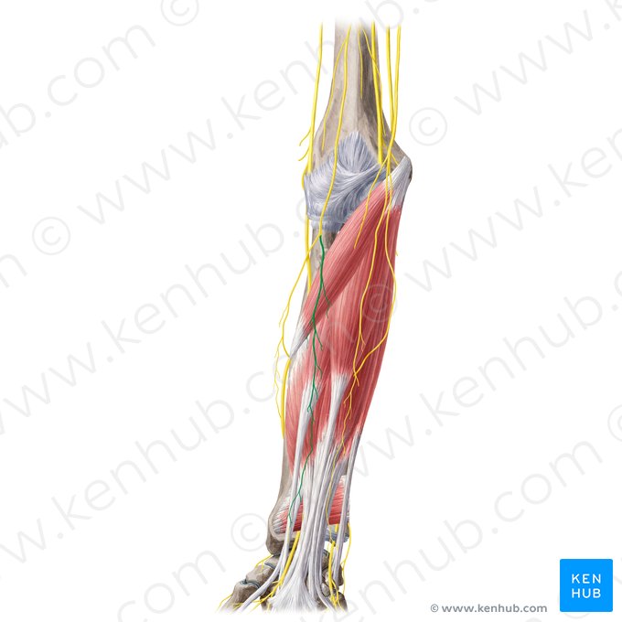 | Radial nerve | Posterior antebrachial cutaneous nerve Muscular branches of radial nerve Deep branch of radial nerve (Posterior interosseous nerve) Superficial branch of radial nerve |