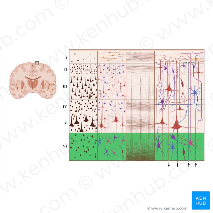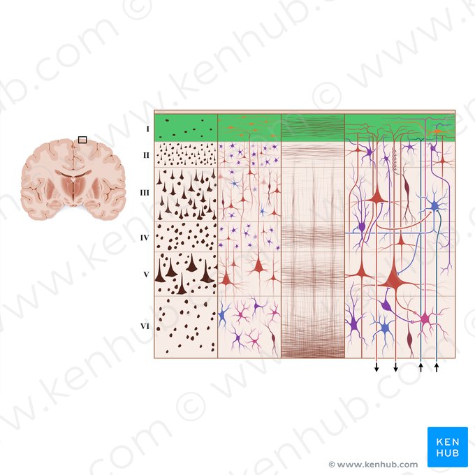 The cerebral cortex comprises the outer layer of the cerebrum and is mainly made up of gray matter. This region of the brain is responsible for numerous higher cognitive functions, including memory, attention, perception and consciousness. The cerebral cortex consists of the evolutionary older allocortex and the younger isocortex, which represents the majority of the cortex. The allocortex consists of 3 - 4 layers and the isocortex consists of 6 layers.
