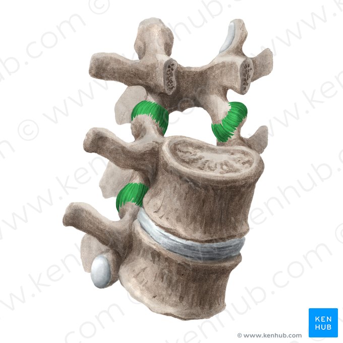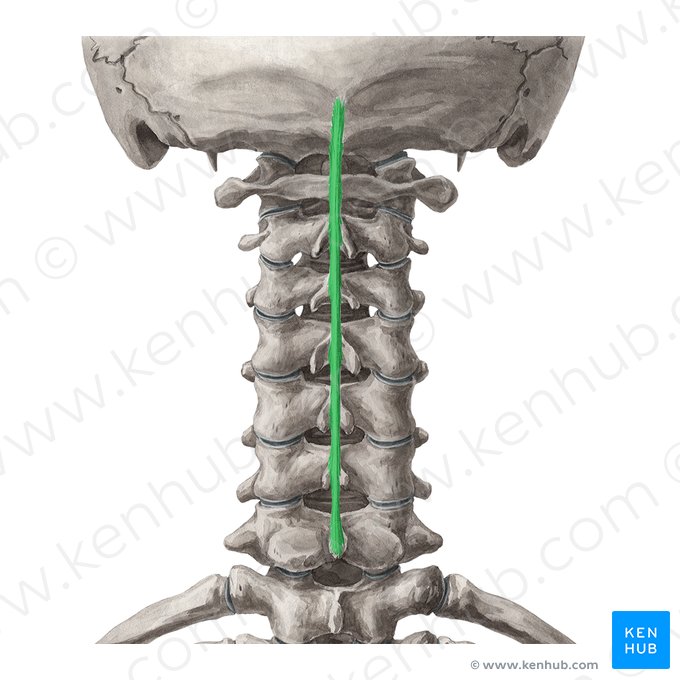 Main ligaments: Anterior longitudinal ligament: Anterior aspect of vertebral bodies and intervertebral discs Posterior longitudinal ligament: Posterior aspect of vertebral bodies and intervertebral discs Accessory ligaments: Ligamenta flava: Posterior surface of vertebral canal, along adjacent laminae Interspinous ligaments: Adjacent spinous processes Supraspinous ligament: Extremities of spinous processes Intertransverse ligaments: adjacent transverse processes Nuchal ligament: External occipital protuberance to spinous process of C7 |