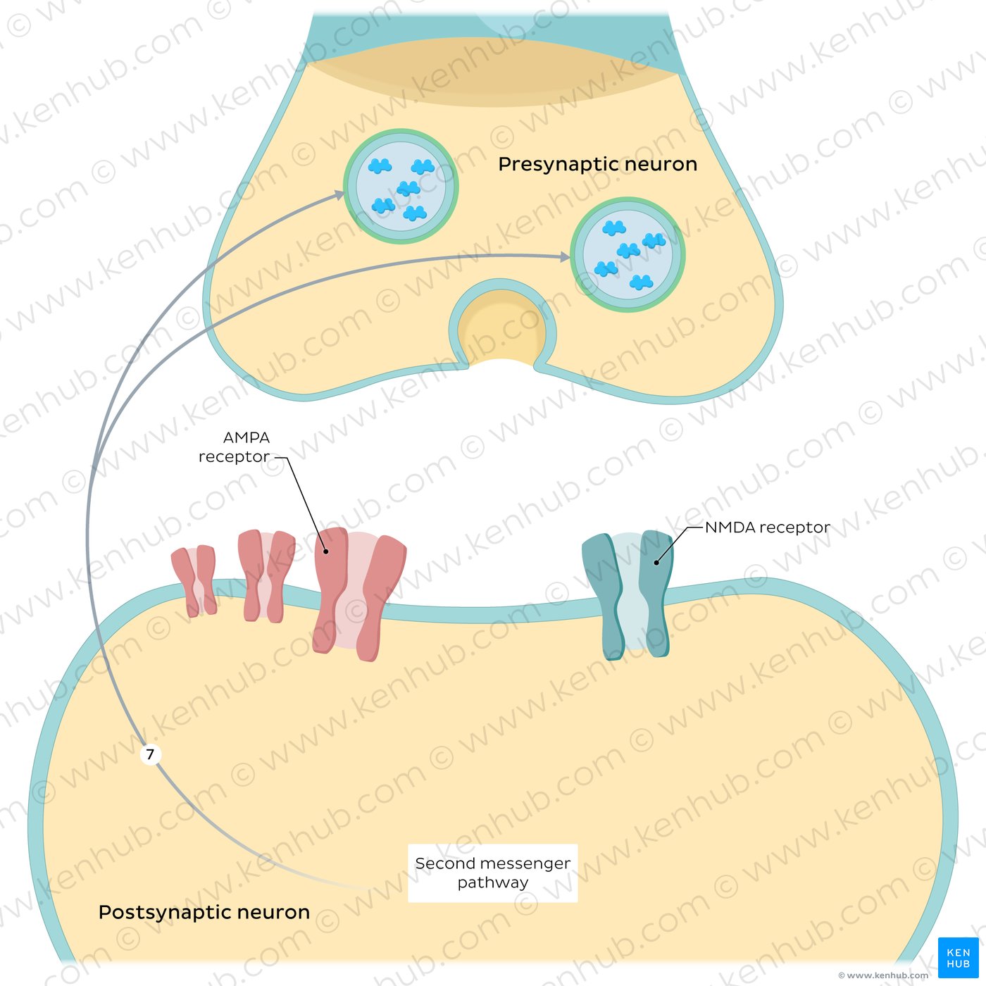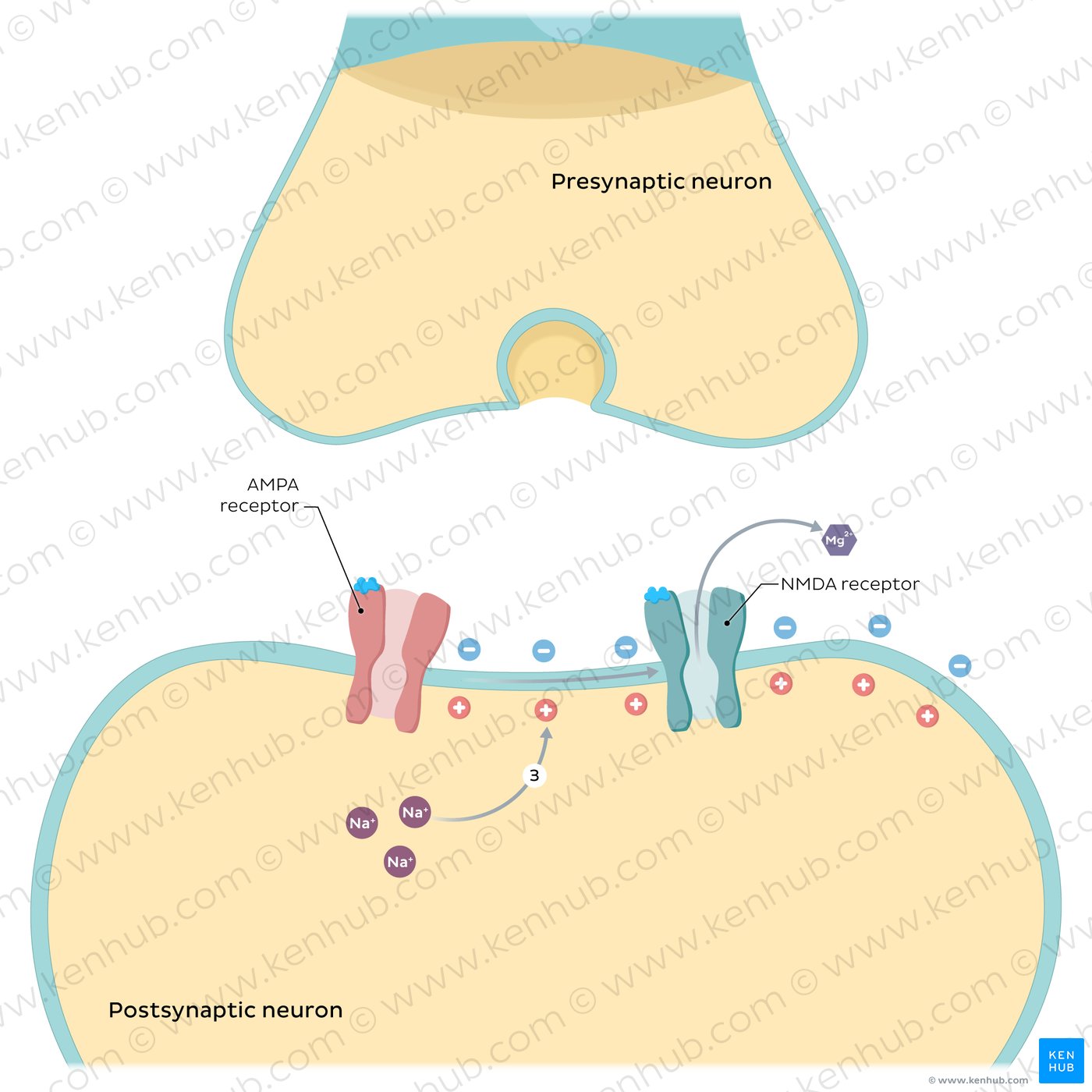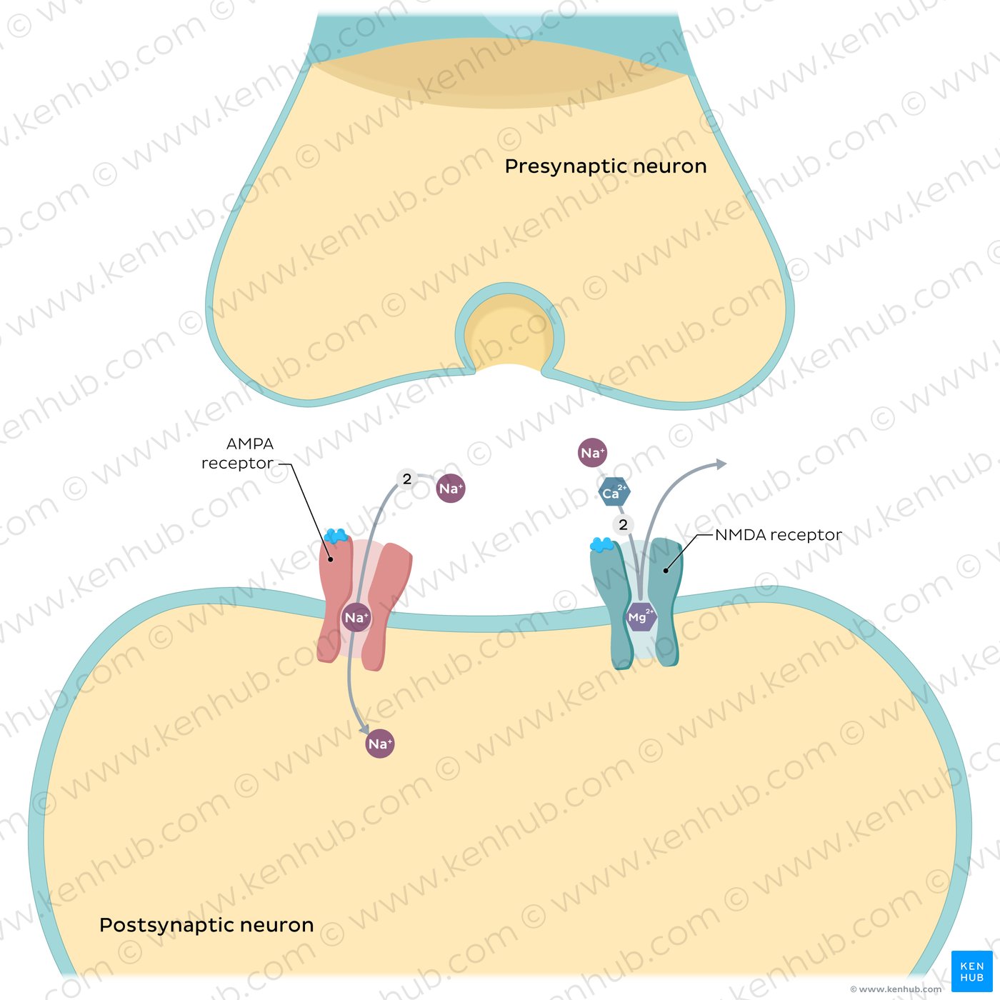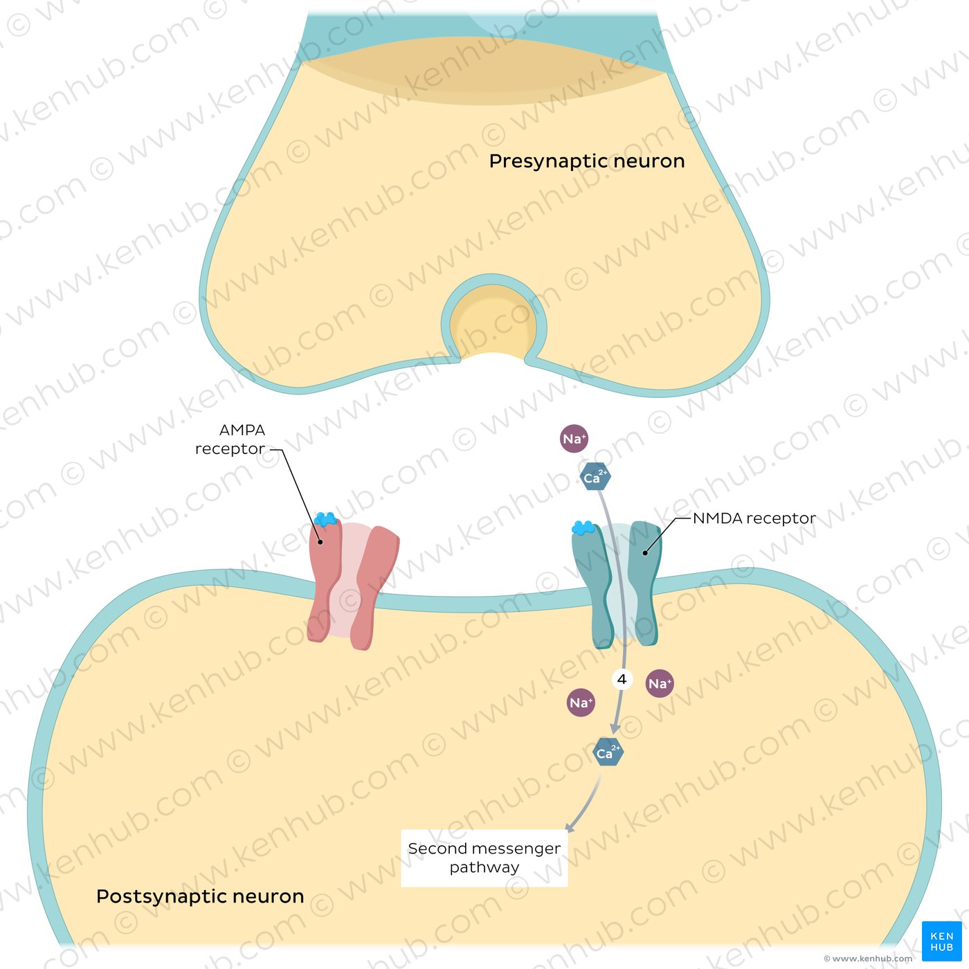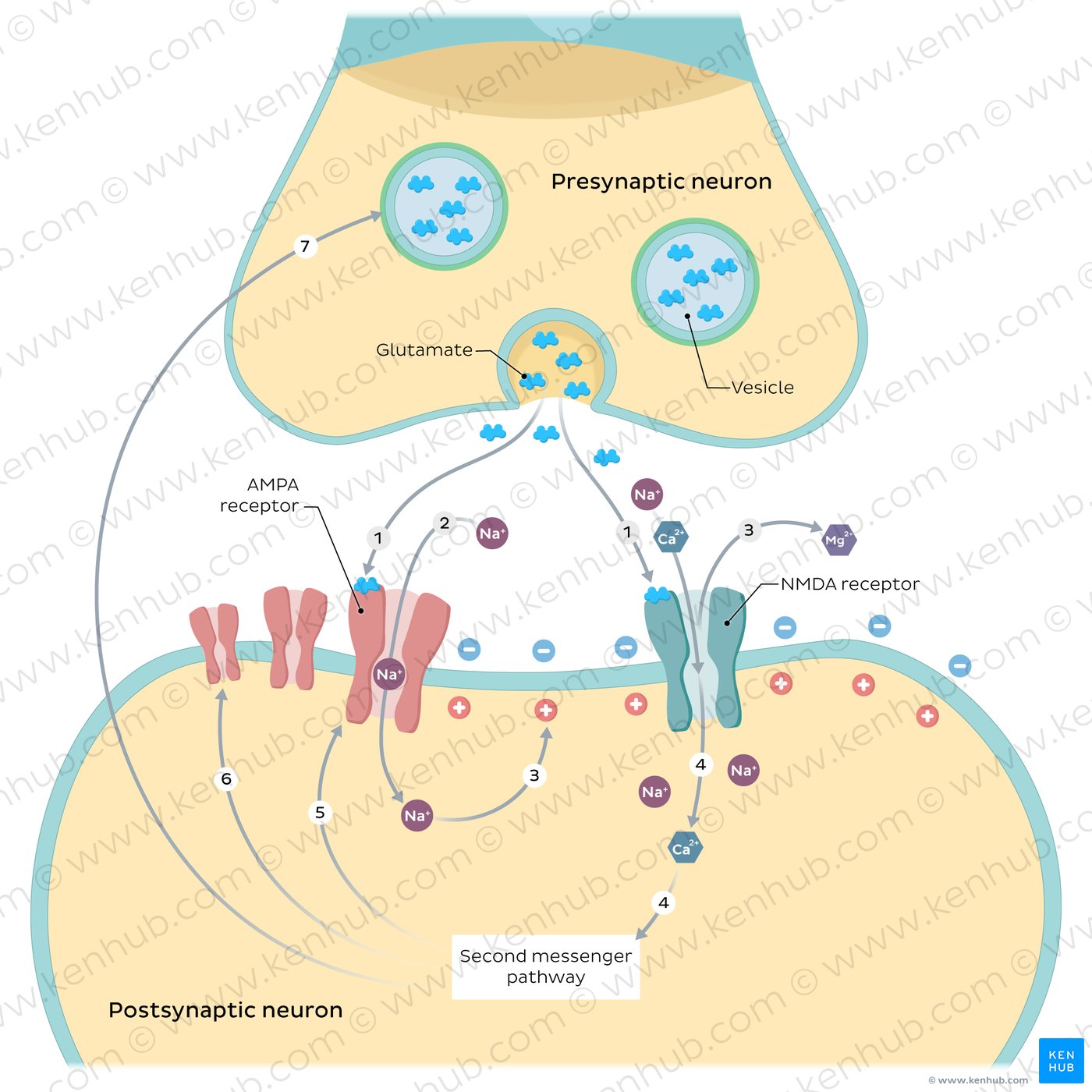 | Long term potentiation | Presynaptic neuron releases glutamate > Na⁺ enters through AMPA channels > membrane depolarization > Mg²⁺ dislodges from NMDA channels > Ca²⁺ enters the cell and activates second-messenger system > strengthened synaptic connections (more AMPA channels, AMPA channels have increased conductance, presynaptic neuron releases more glutamate) |