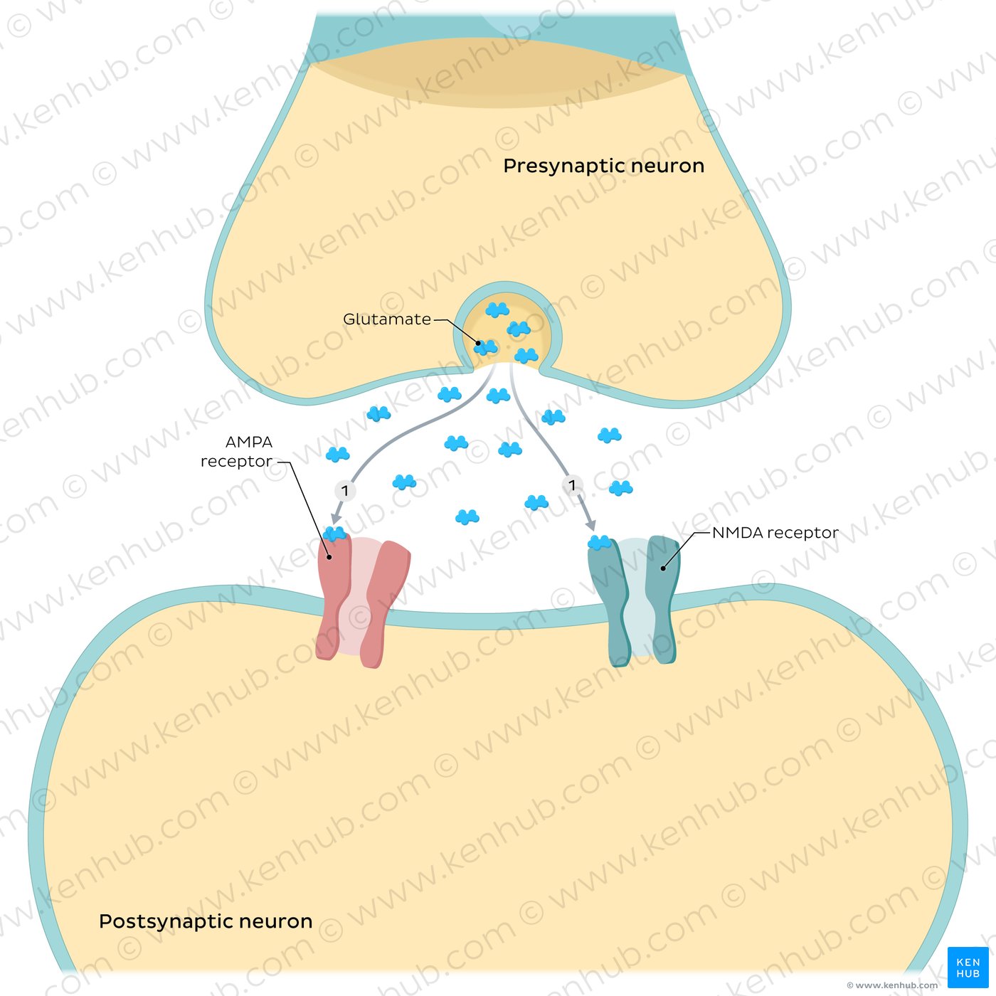 Memories are consolidated by strengthening the connections between neurons through long-term potentiation (or LTP). The glutamate released by the presynaptic neuron binds to AMPA receptors on the post-synaptic neuron. Sodium ions flow into the cytoplasm and depolarize the cell, facilitating the flow of Calcium ions through NMDA channels. The increased intracellular concentration of Calcium increases the amount of glutamate released by the presynaptic cell and improves the flow of ions through the membrane of the postsynaptic neuron. This strengthened synaptic connection between neurons forms pathways in the brain that store and retrieve memories.
