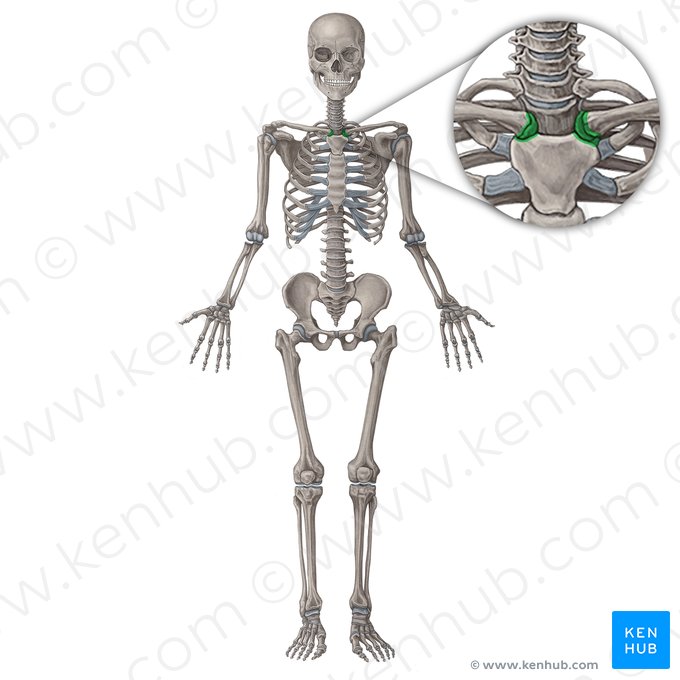 Temporomandibular joint: Mandible and temporal bone Zygapophyseal joints: Superior and inferior articular process of adjacent vertebrae Sternoclavicular joint: Sternum and clavicle Acromioclavicular joint: Acromion of scapula and clavicle Glenohumeral joint: Humerus and scapula Elbow joint: Humerus, radius and ulna Radiocarpal joint: Radius and carpal bones Carpometacarpal joints: Carpal and metacarpal bones Metacarpophalangeal joints: Metacarpal bones and phalanges of hand |