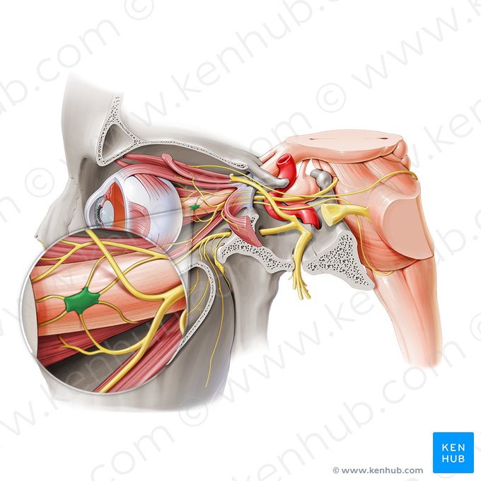 Fiber types: General somatic efferent fibers (GSE), general visceral efferent fibers (GVE) Origin: Ventral midbrain (interpeduncular fossa) Exits skull: Superior orbital fissure Nuclei: Nucleus of oculomotor nerve (GSE); accessory nucleus of oculomotor nerve (Edinger-Westphal) (GVE) Branches: Superior and inferior branch, branch of oculomotor nerve to ciliary ganglion (parasympathetic root of ciliary ganglion) Function: Superior branch → Motor innervation to superior rectus, levator palpebrae superioris muscles Inferior branch → medial rectus, inferior rectus, inferior oblique muscles (GSE); branch to ciliary ganglion → parasympathetic innervation to ciliary and sphincter pupillae muscles (GVE) |