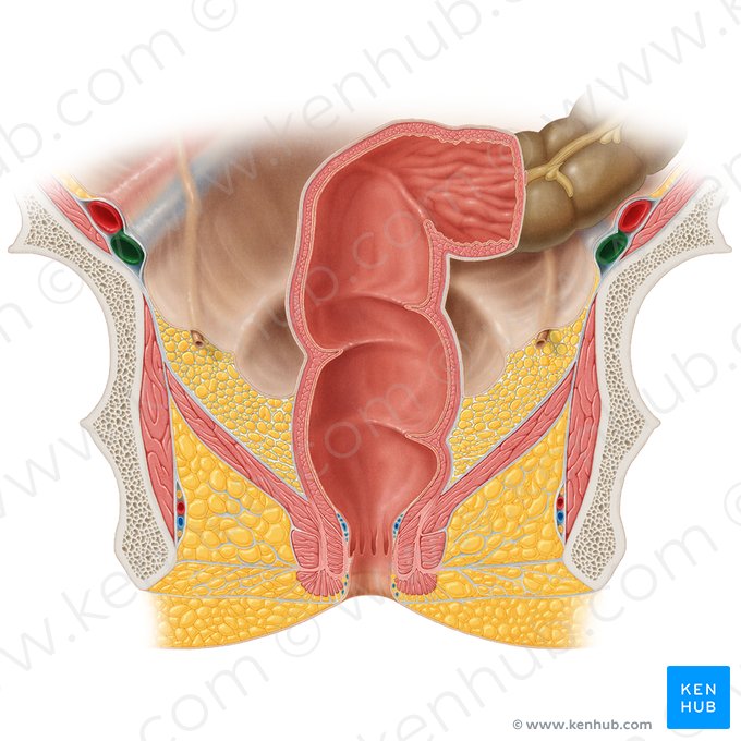 The rectum and anal canal are located in the pelvic cavity and are the terminal structures of the gastrointestinal tract. The rectum is a direct continuation of the sigmoid colon and is followed by the anal canal, which opens itself to the external environment through the anus. The main functions of these structures is to absorb water and electrolytes, and store feces prior to defecation.