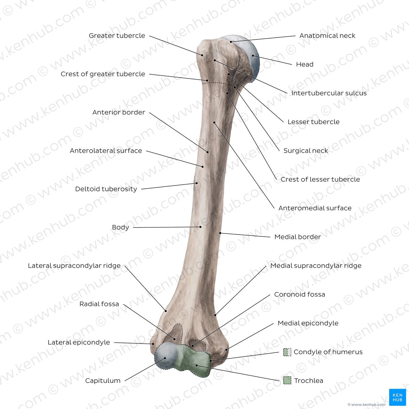 | Proximal end | Head of humerus Anatomical neck Surgical neck Greater tubercle Lesser tubercle Intertubercular sulcus (crest of greater tubercle, crest of lesser tubercle) |