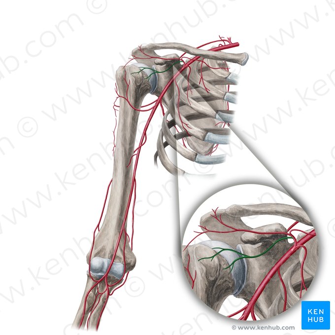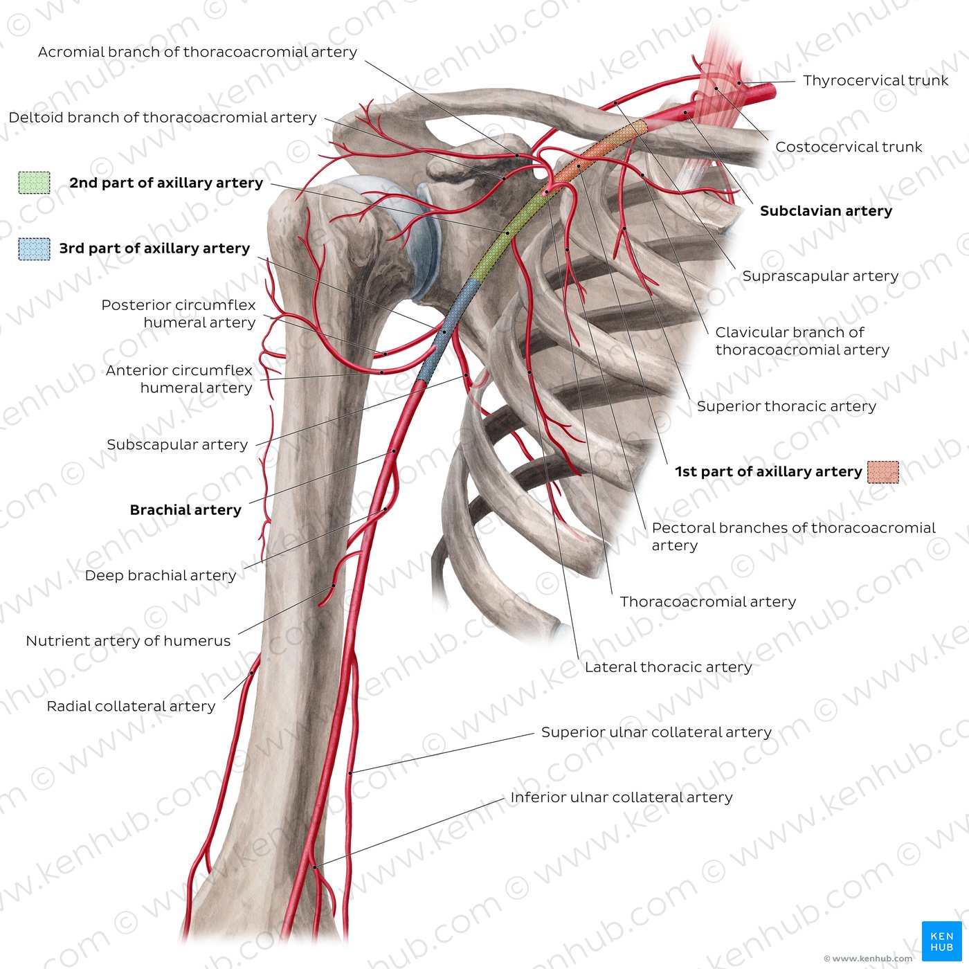 Thoracoacromial artery (pectoralis major/minor, deltoid muscles; skin of clavipectoral region); Subscapular artery (deltoid, latissimus dorsi, [long head of] triceps brachii, subscapularis muscle, supra-/infraspinatus, serratus anterior muscles); Superior thoracic artery (pectoral, serratus anterior, subclavius muscles, upper intercostal muscles; skin of the thoracic wall) Lateral thoracic artery (axillary lymph nodes; breasts/anterior thoracic wall; serratus anterior, pectoralis major/minor, subscapularis muscles). Anterior/posterior circumflex humeral arteries (shoulder joint, proximal humerus, deltoid muscle) |
