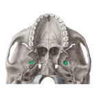If we have a lesser palatine foramina, we have to have then a greater palatine foramina. And they are located anterior to the lesser palatine foramina on the palatine bone. And the greater palatine nerves and also vessels pass through these structures.